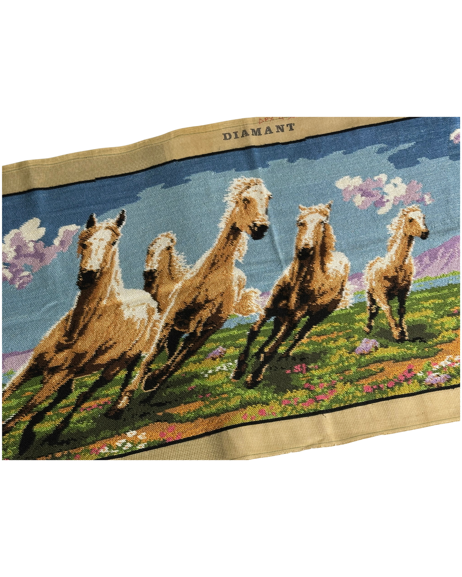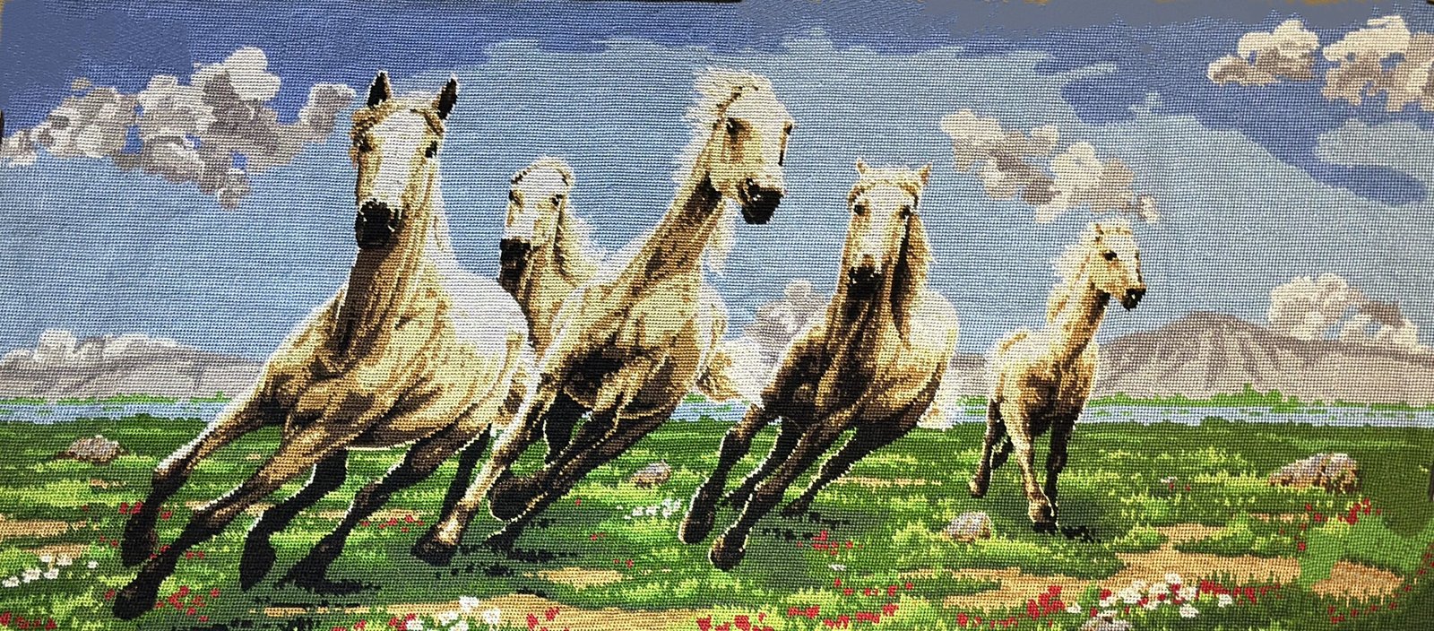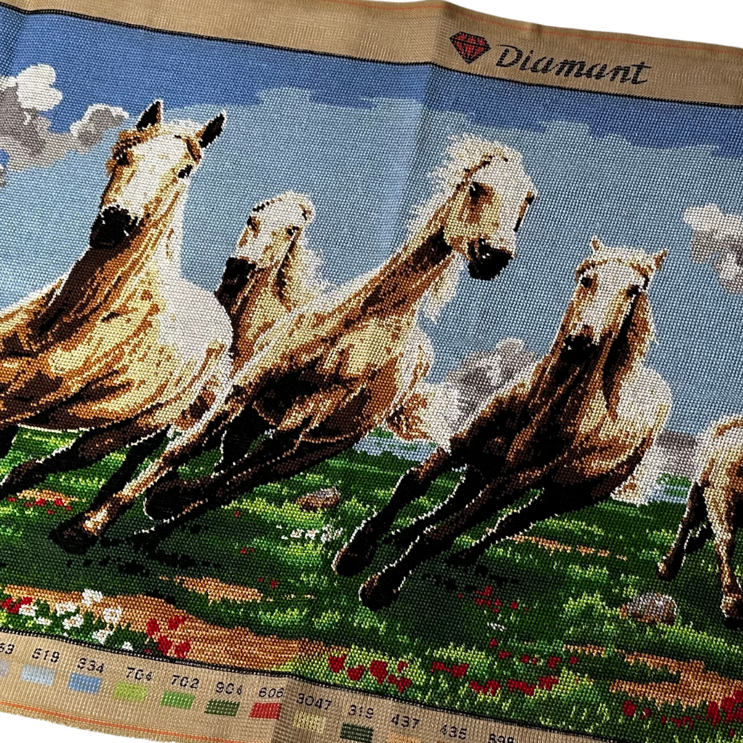 Αποτύπωσε τη δυναμική ομορφιά και την ελευθερία των αλόγων με αυτό το χειροποίητο vintage κέντημα, που απεικονίζει άλογα να τρέχουν σε ένα μαγευτικό τοπίο. Ιδανικό για διακόσμηση σε κορνίζα, προσδίδει αίσθηση κίνησης, ενέργειας και φυσικής αρμονίας στον χώρο σου.