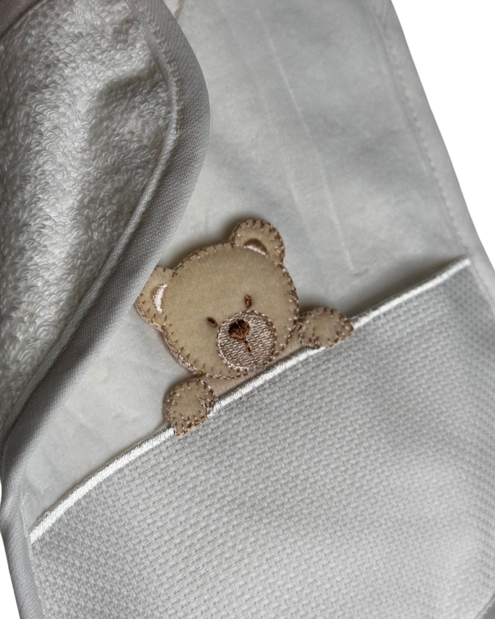 Πανέμορφη και πρακτική σαλιάρα από μαλακό ύφασμα, σχεδιασμένη με τσεπούλα από φάσα για κέντημα. Τα δύο μέρη χωρίζονται από ένα χαριτωμένο αρκουδάκι, προσθέτοντας μια γλυκιά πινελιά. Στην φάσα μπορεί να προστεθεί διακοσμητικό σχέδιο όπως όνομα, λεπτά περιγράμματα, φλοράλ μοτίβα, αστεράκια, καρδιές, παιδικές φιγούρες, ή οποιοδήποτε σχέδιο επιθυμείτε. Αυτό δίνει μια πιο κομψή και ολοκληρωμένη αισθητική στο τελικό αποτέλεσμα, δημιουργώντας ένα μοναδικό, προσωποποιημένο δώρο.
