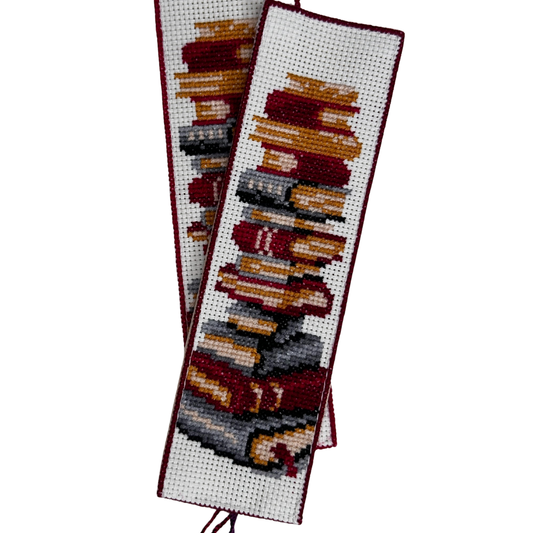 Χειροποίητος υφασμάτινος κεντημένος σελιδοδείκτης με λεπτομερές κέντημα, σε σχέδιο Στοιβαγμένα Βιβλία.