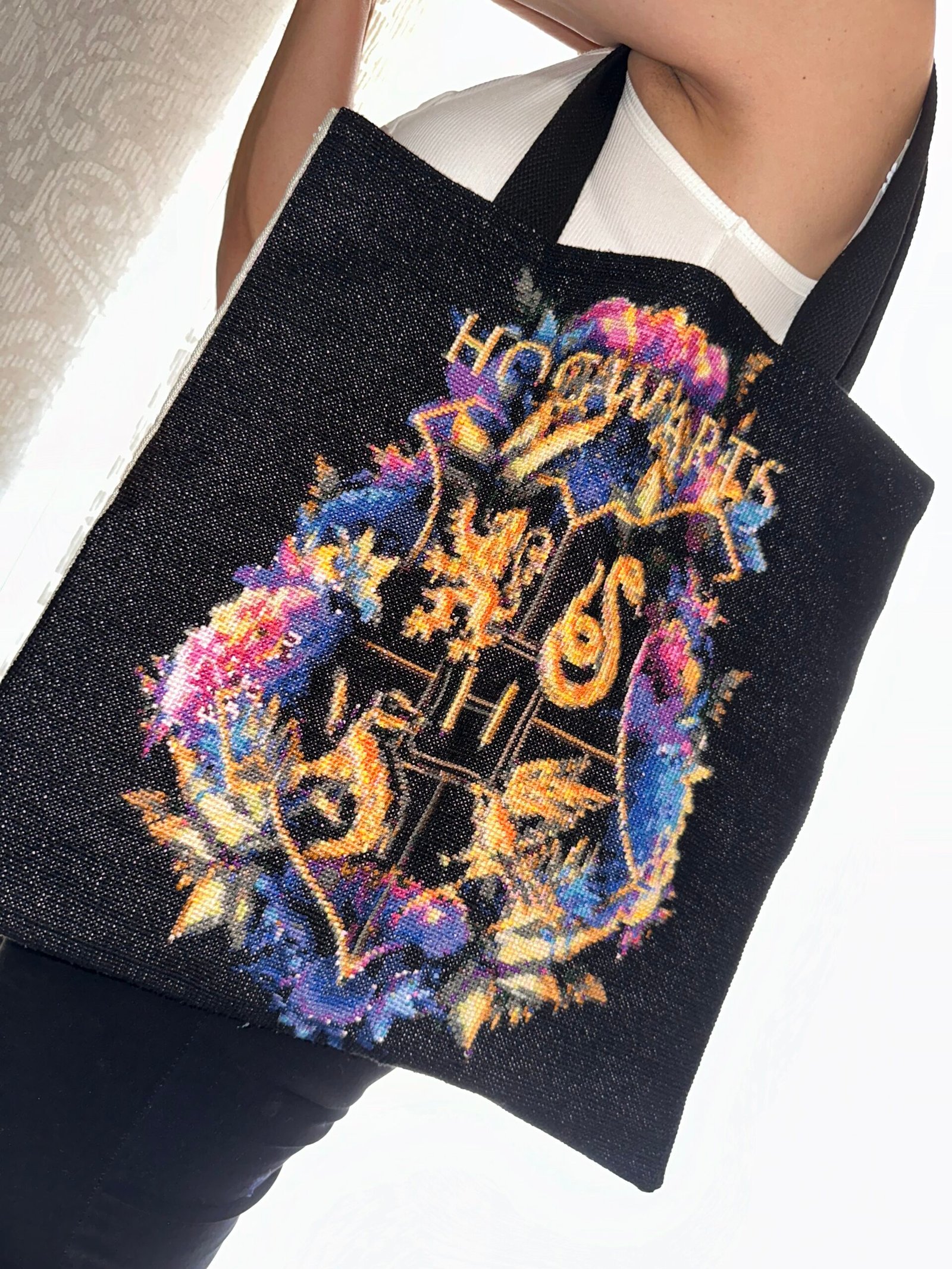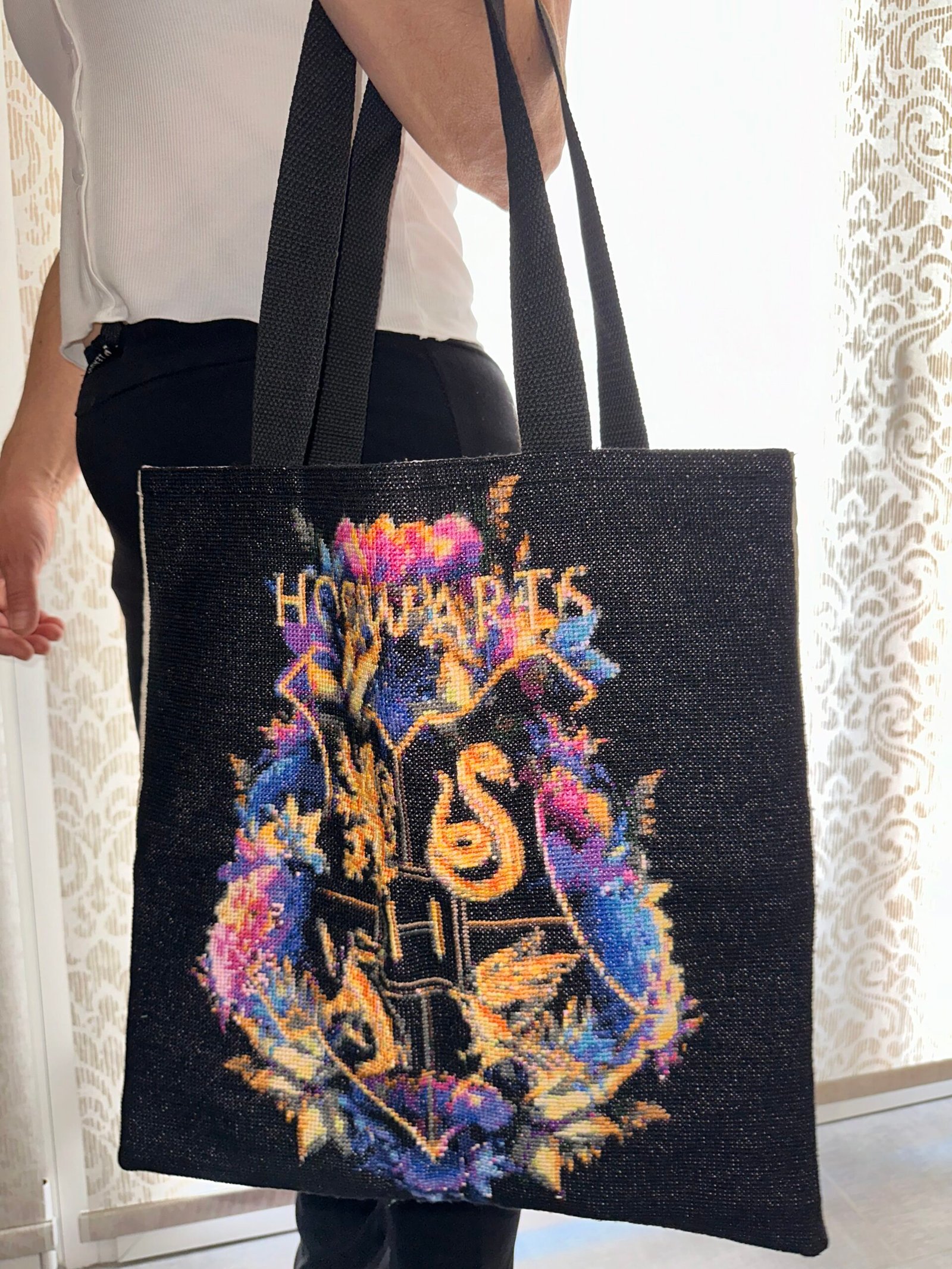 Ανέδειξε το στυλ σου με αυτήν την υπέροχη χειροποίητη κεντημένη τσάντα, φιλοτεχνημένη με την τεχνική της σταυροβελονιάς και διακοσμημένη με τα λογότυπα από τα τέσσερα εμβληματικά σπίτια του Harry Potter – Gryffindor, Slytherin, Hufflepuff και Ravenclaw – σε μάυρο κεντημένο φόντο. Φτιαγμένη με μεράκι και έμπνευση από την παράδοση προσαρμοσμένη στο σήμερα. Η τσάντα διαθέτει μοναδικό σχέδιο κεντήματος, που προσδίδει κομψότητα και αυθεντικότητα!