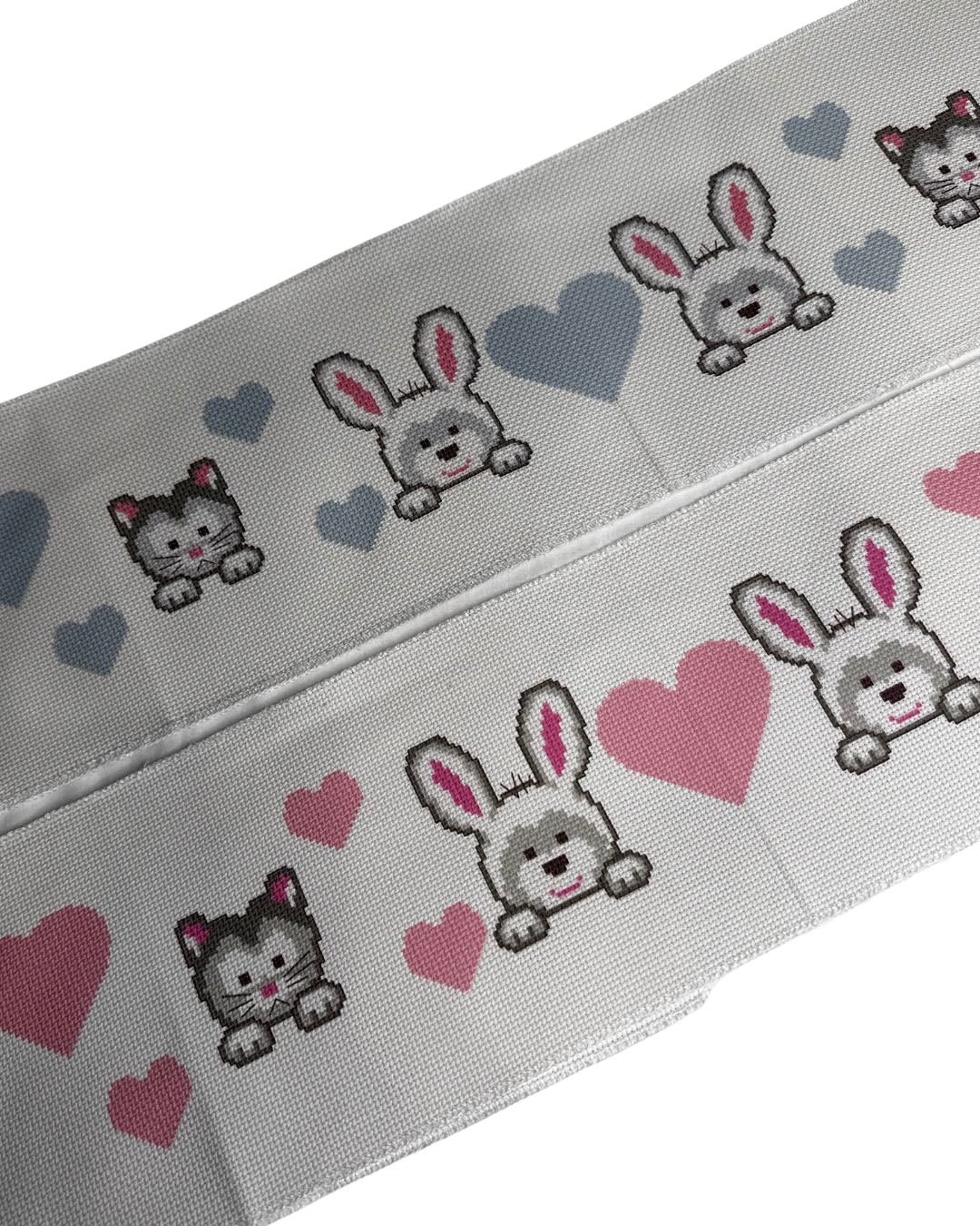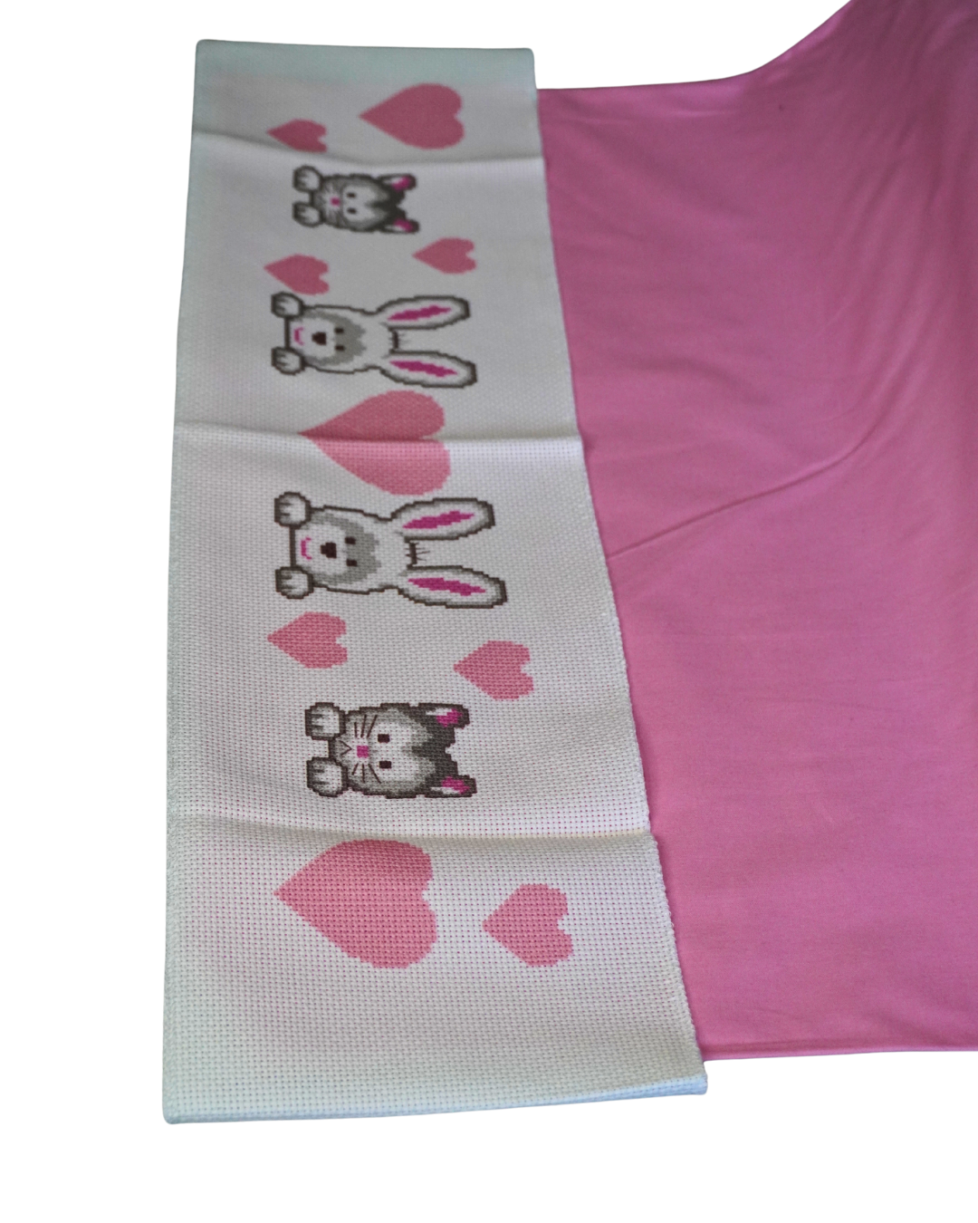Δώσε μια τρυφερή και παραμυθένια πινελιά στο παιδικό δωμάτιο με αυτήν τη χειροποίητη κεντημένη φάσα! Με υπέροχο σχέδιο από λαγουδάκια και γατάκια σε αποχρώσεις του ροζ, αυτή η φάσα είναι ιδανική για να διακοσμήσετε την κούνια, το κρεβατάκι ή ακόμα και το καροτσάκι της μικρής σας. Το προσεκτικά επιλεγμένο ύφασμα προσφέρει ανθεκτικότητα και είναι απαλό και ασφαλές για το ευαίσθητο βρεφικό δερματάκι.