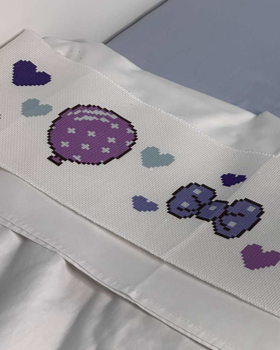 ✔️ Χαριτωμένο σχέδιο – Κορδέλα και μπαλόνια πλαισιωμένα με καρδούλες σε απαλούς σιέλ τόνους.