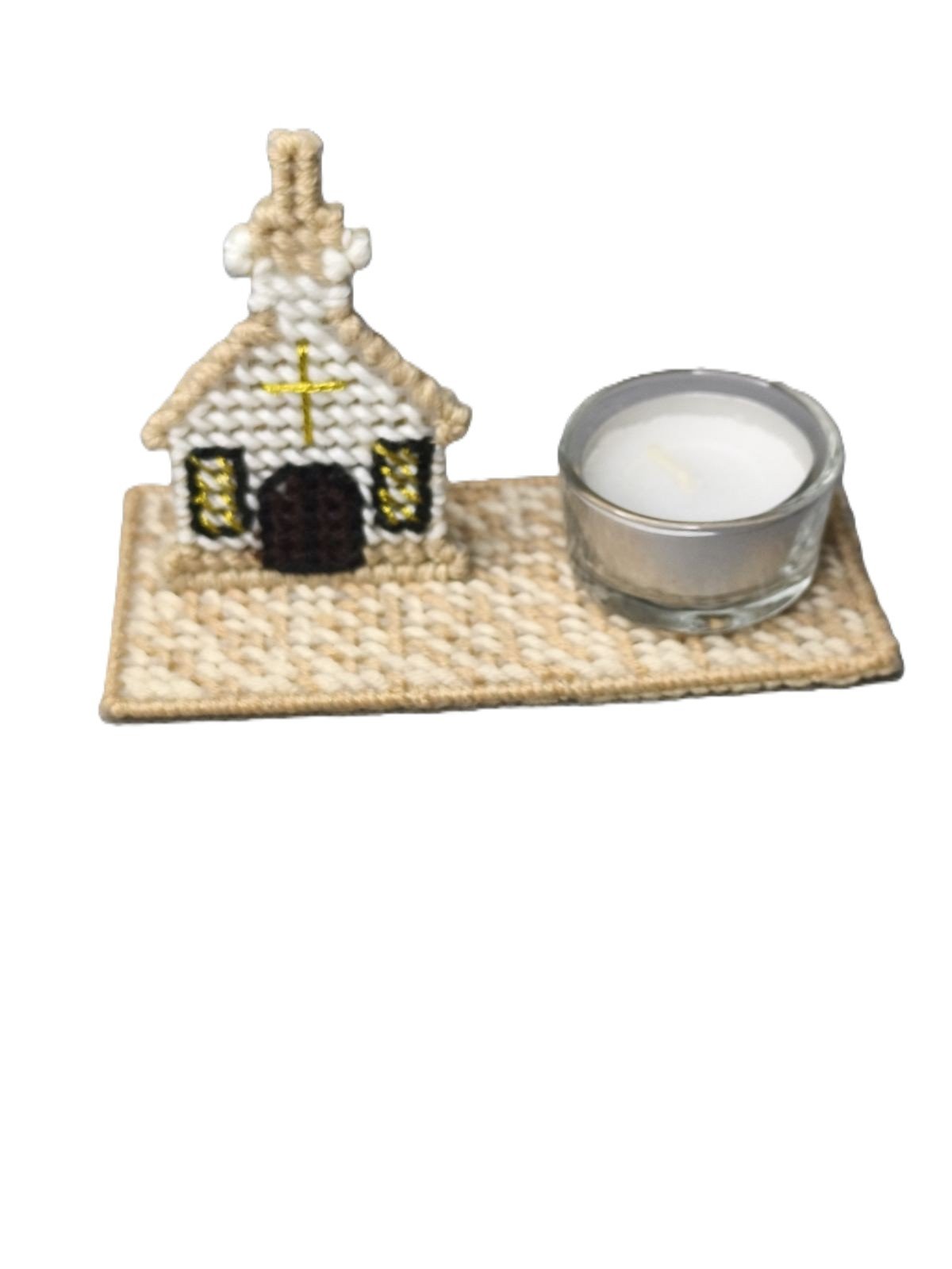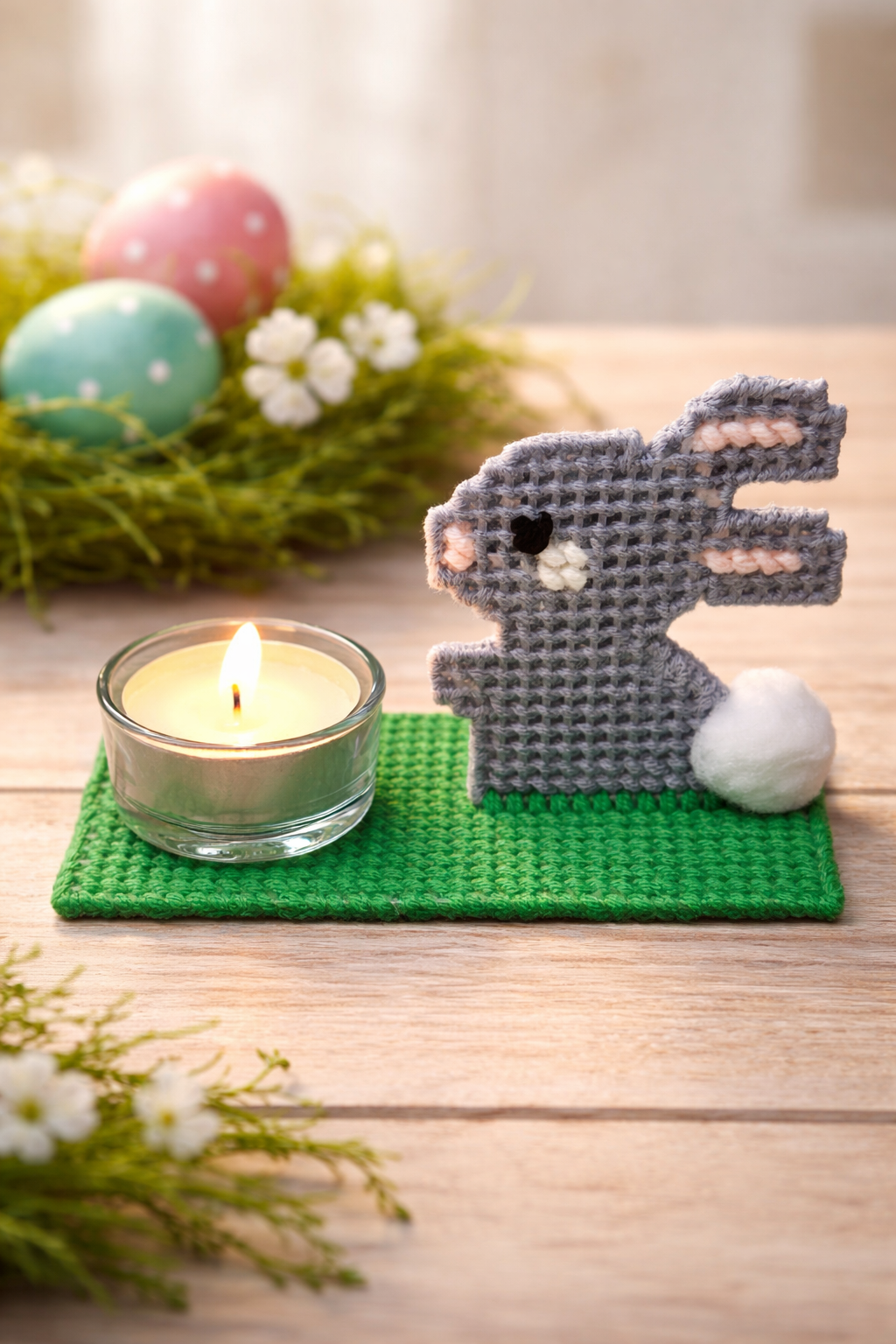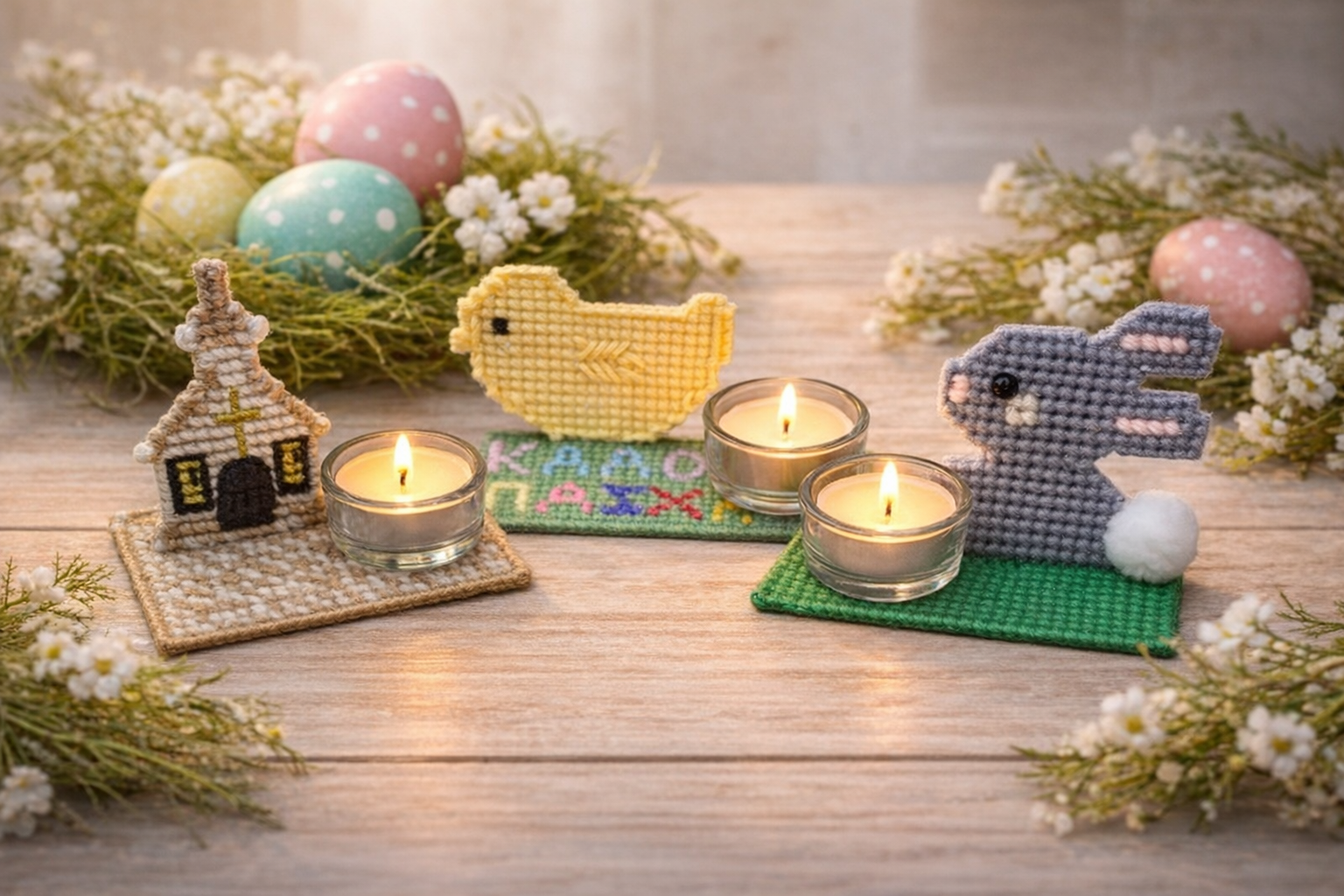 Ένα χειροποίητο πασχαλινό διακοσμητικό που συνδυάζει το κέντημα με το απαλό φως ενός ρεσώ. Το σχέδιο κεντιέται σε πλαστικό καμβά και στερεώνεται πάνω σε βάση, ενώ το ρεσώ τοποθετείται σε γυάλινη θήκη δίπλα στο διακοσμητικό.