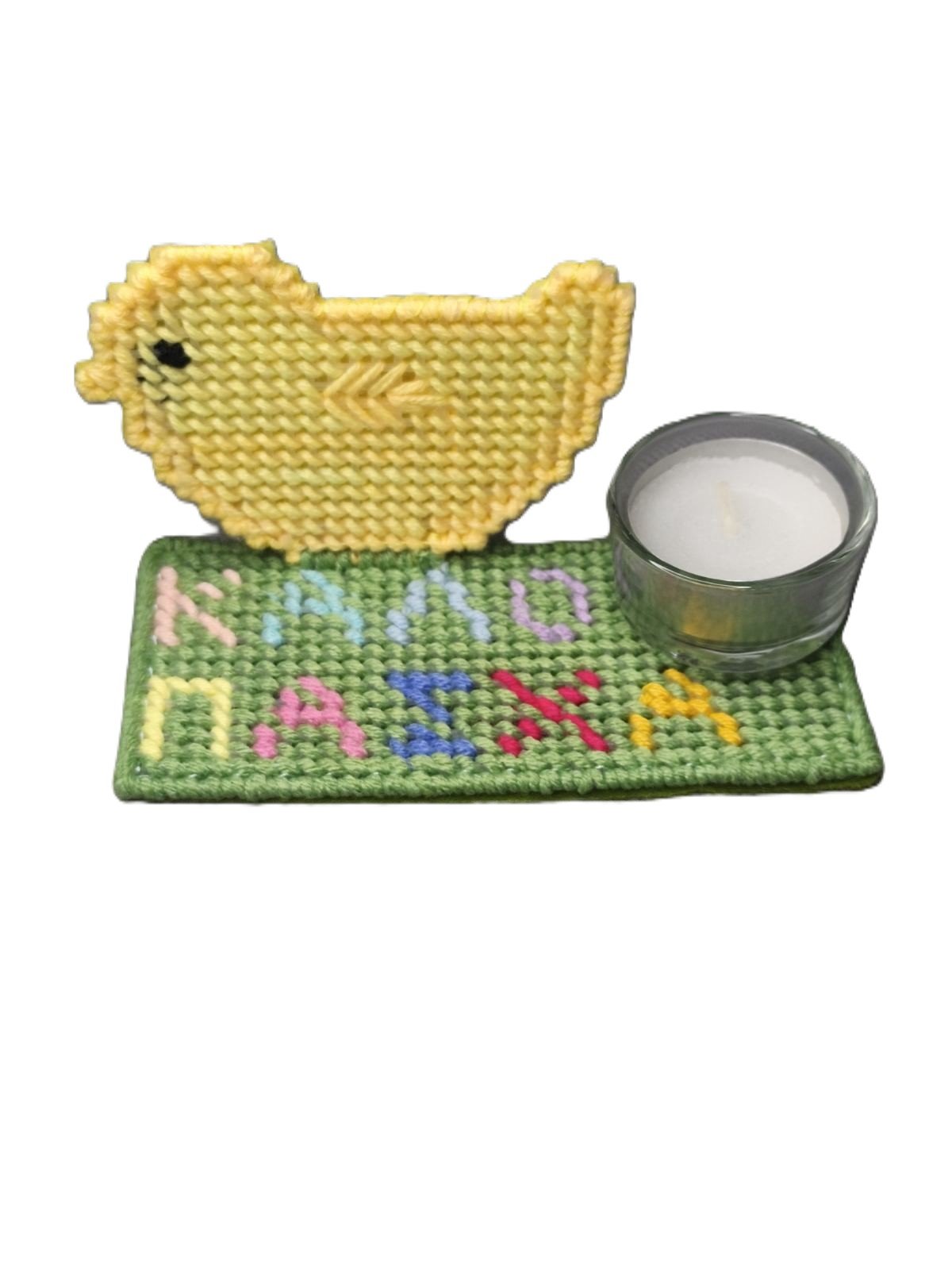 Χειροποίητο κεντημένο πασχαλινό διακοσμητικό σε πλαστικό καμβά, τοποθετημένο πάνω σε βάση με γυάλινη θήκη για ρεσώ. Ένα ζεστό διακοσμητικό στοιχείο που φωτίζει όμορφα το πασχαλινό τραπέζι ή τον χώρο σου.