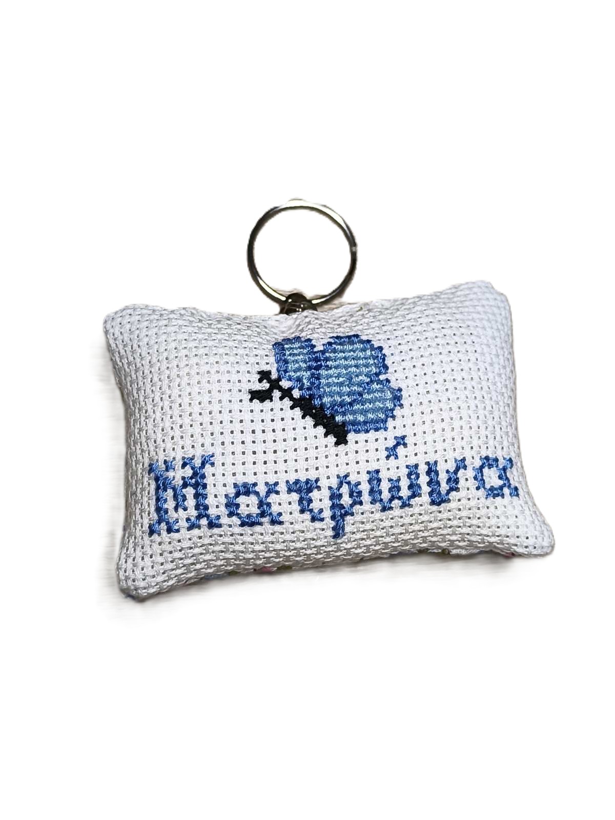 Χειροποίητο κεντημένο μπρελόκ σε μορφή μικρού μαξιλαριού.